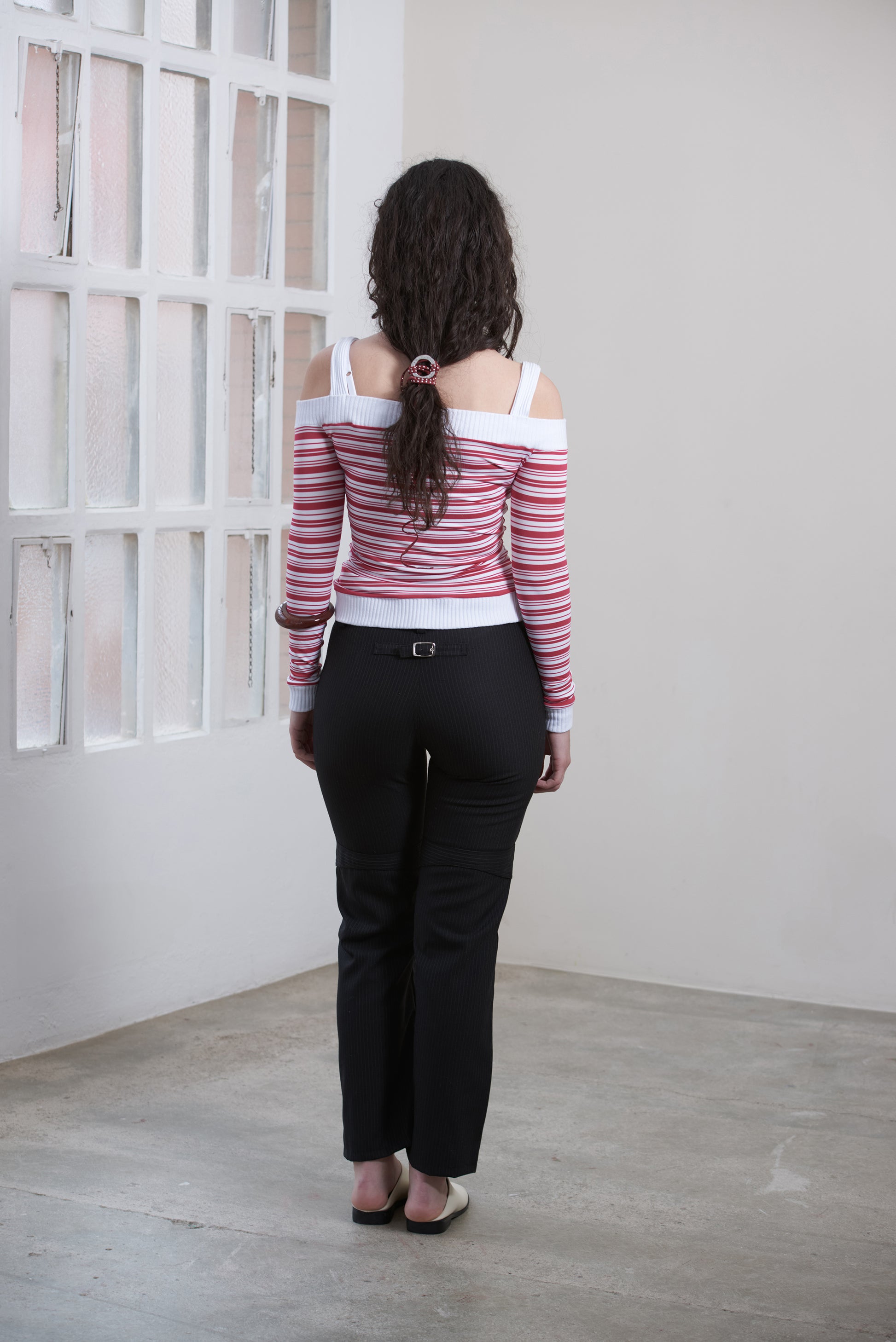Tailored with an edge, these pinstripe trousers bring a refined silhouette from a classic utilitarian look. Crafted from a structured wool-blend fabric with subtle vertical stripes, they feature adjustable metal buckles at the knees and back waist—offering both a functional fit and a distinctive style. Ideal for elevated everyday looks or dressed-down tailoring.
