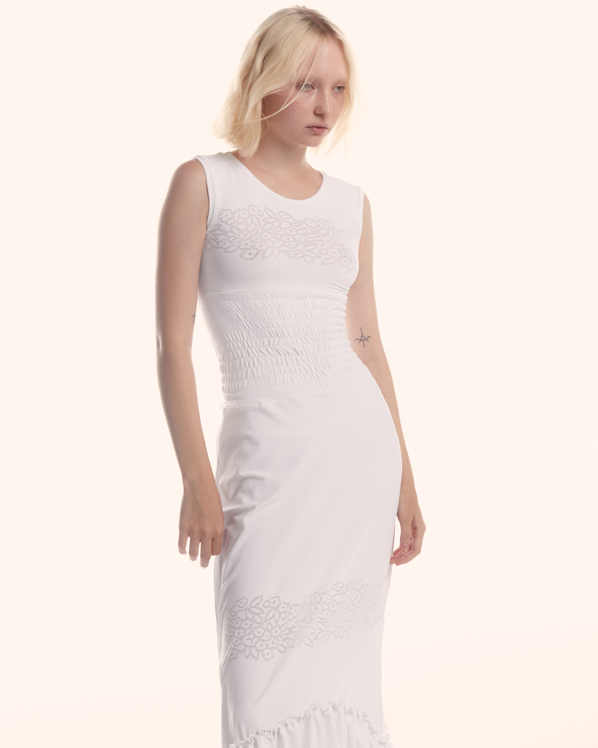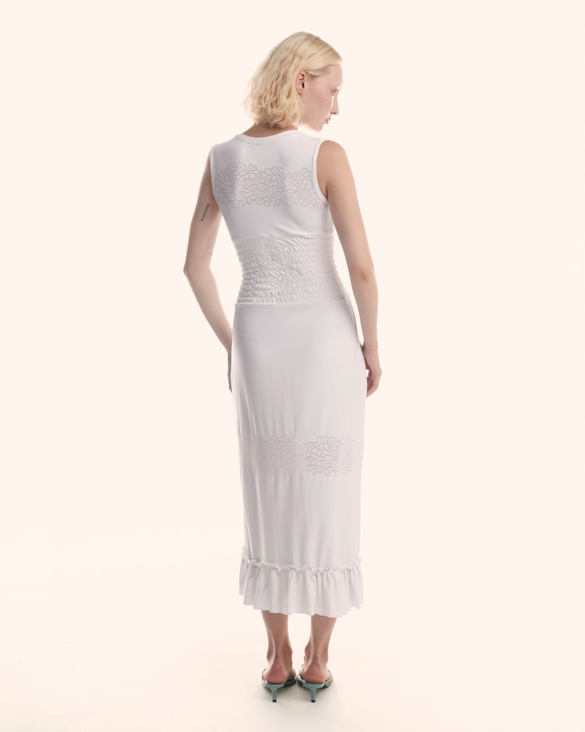 White mid-calf dress with asymmetrical flounces and openwork decorative floral motif, 95% cotton / 5% lycra, elastic and perfect fit thanks to its gathered sash, elegant and comfortable