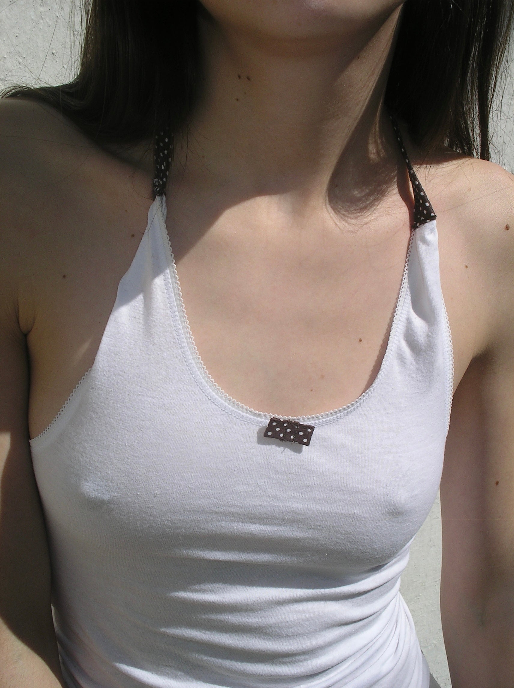 A lightweight halter-style top made from soft, breathable cotton with a touch of stretch. It features contrast brown tie straps with a white polka-dot print that fasten at the neck, creating a clean open-back silhouette. Finished with a subtle front bow detail for a playful touch. Designed to be simple, versatile, and flattering.