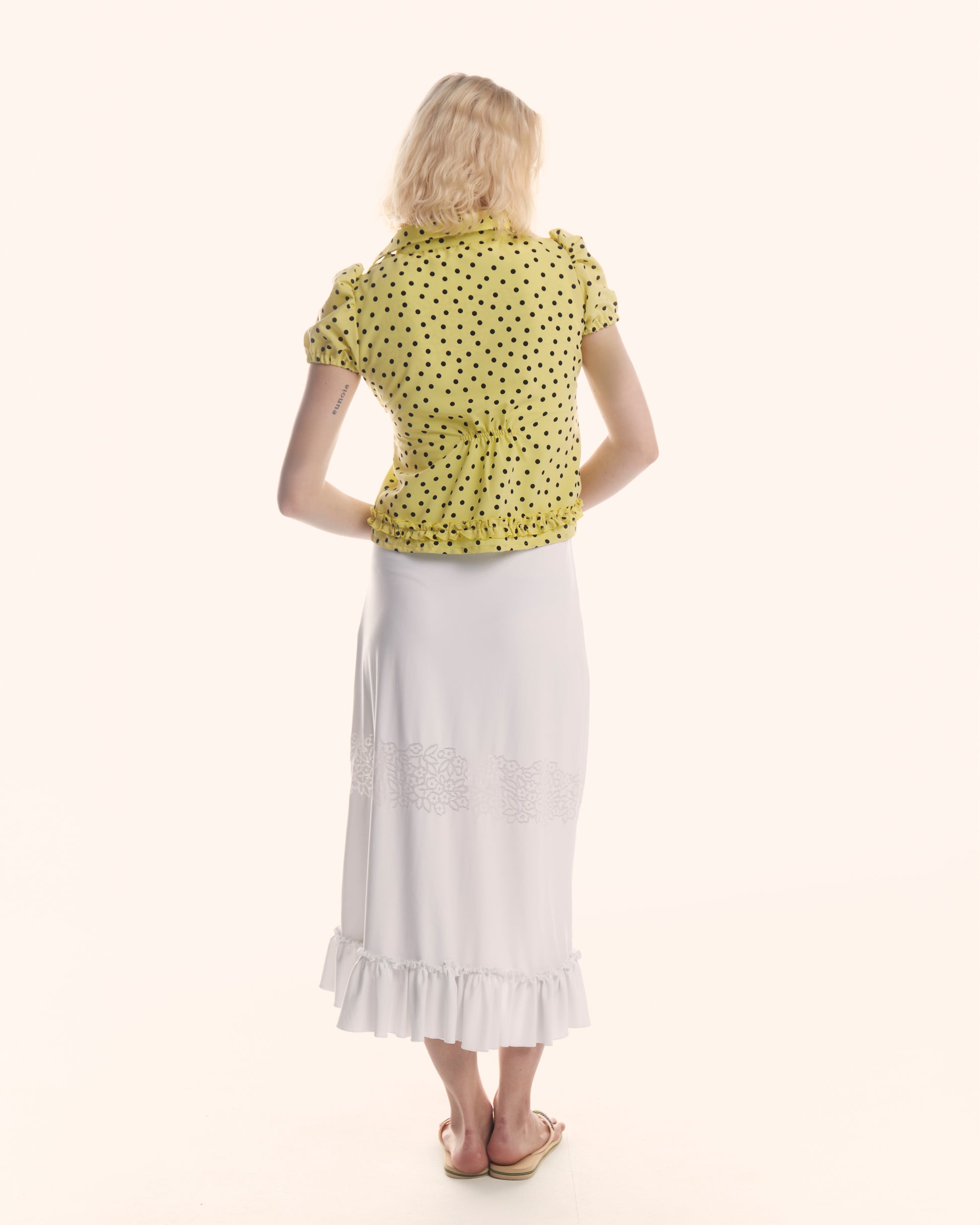 Polka dot shirt with puff sleeves and a drawstring at the chest to improve its fit, it has a decorative trim at the end of the garment, small elastic band on the back at the waist, both decorative and functional, button closure and shirt collar, Crepe fabric.