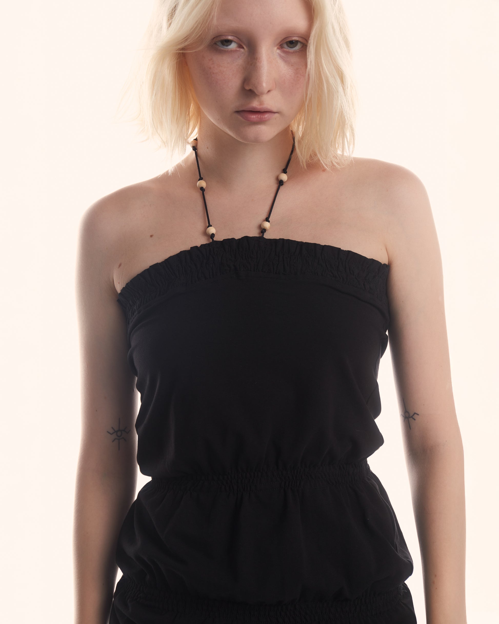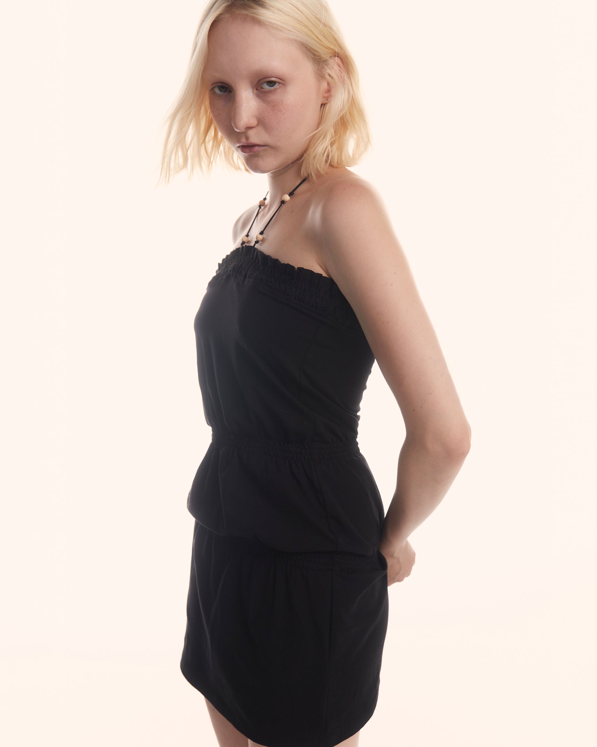 Black mini dress with laces decorated with washable wooden beads at the neck and elastic on the chest with decorative openwork cotton fabric on this, it has two more elastic bands distributed along the length of the dress for greater versatility and design 95% cotton / 5% lycra, elastic cool and comfortable.