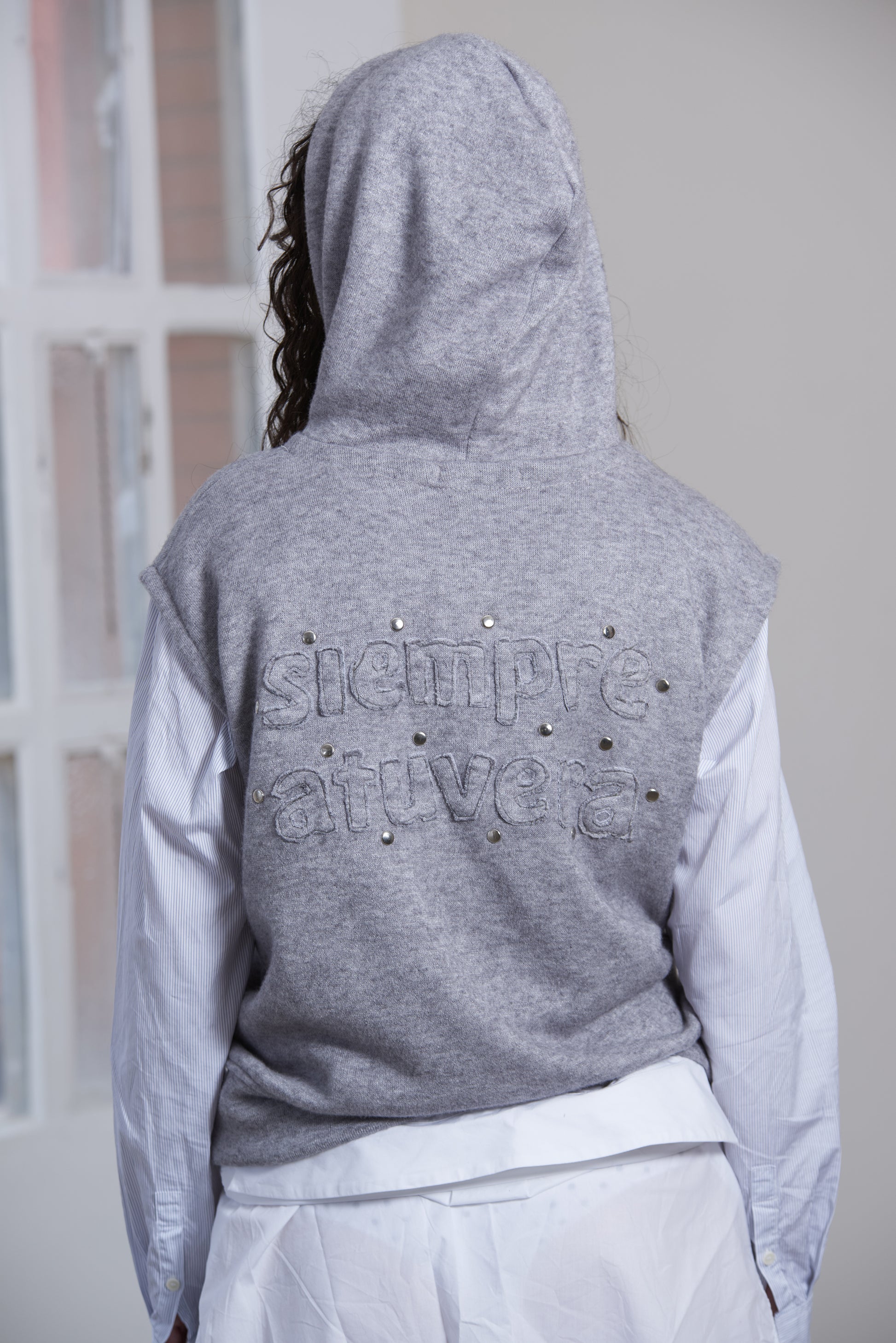 A contemporary sleeveless hoodie crafted from a soft, stretchy cotton blend. Designed with an adjustable drawstring hood, elasticated waistband, and clean arm openings for a relaxed yet structured fit. Features bold embroidered lettering with metal studs on the back. Ideal for layering or wearing solo in warmer weather.