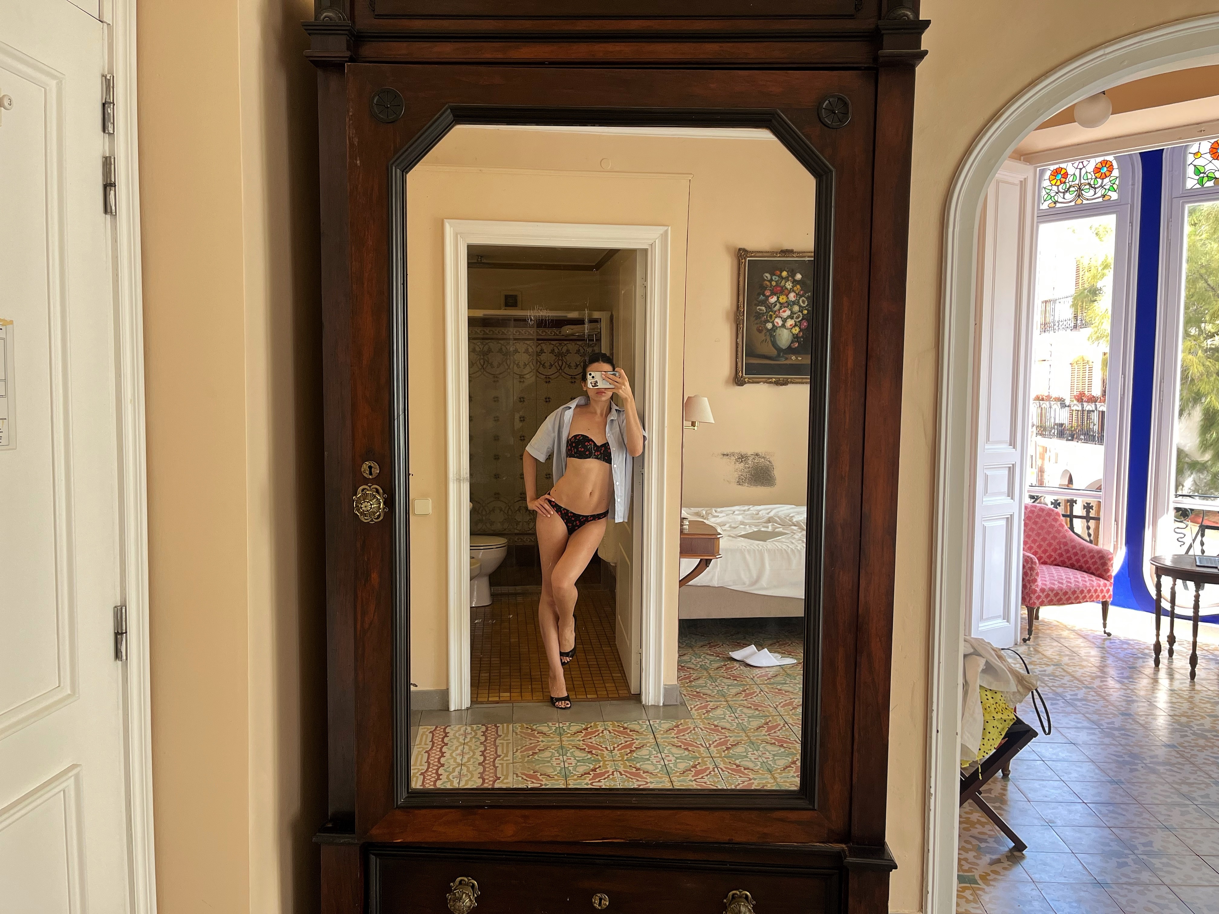 Irene wearing Atuvera’s Spanish Summer Collection, photographed inside the suite of a noucentista- style hotel.