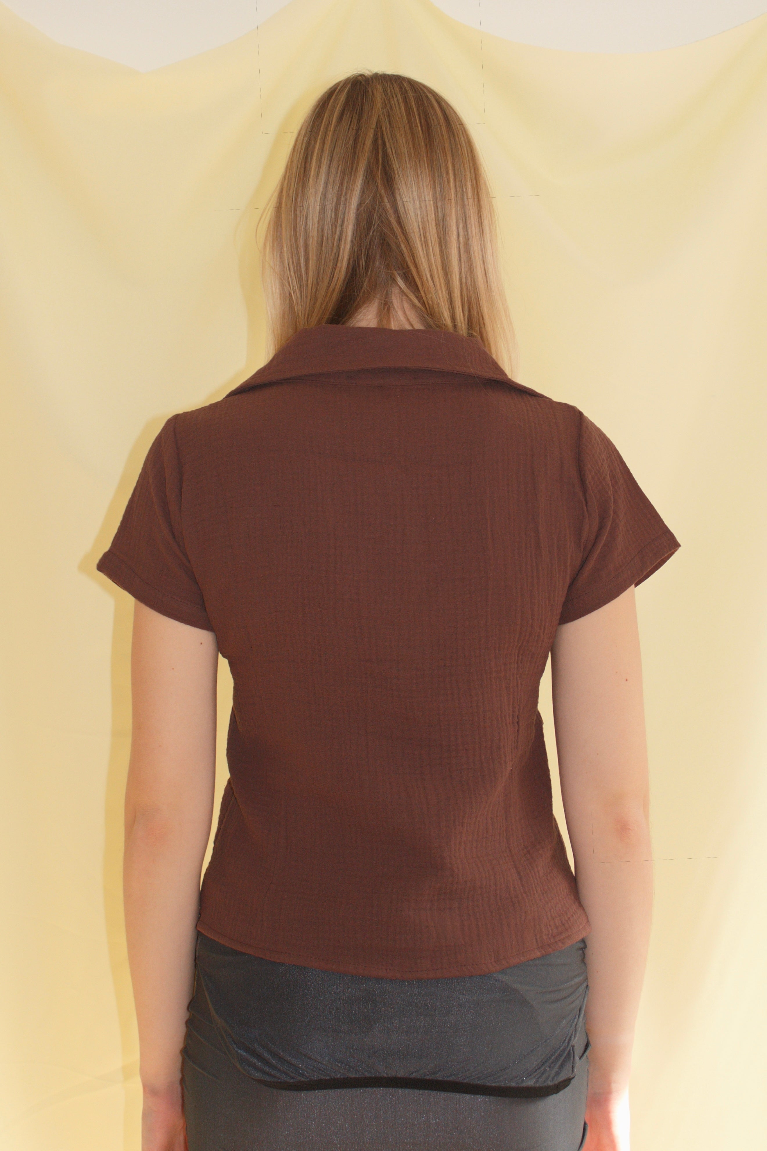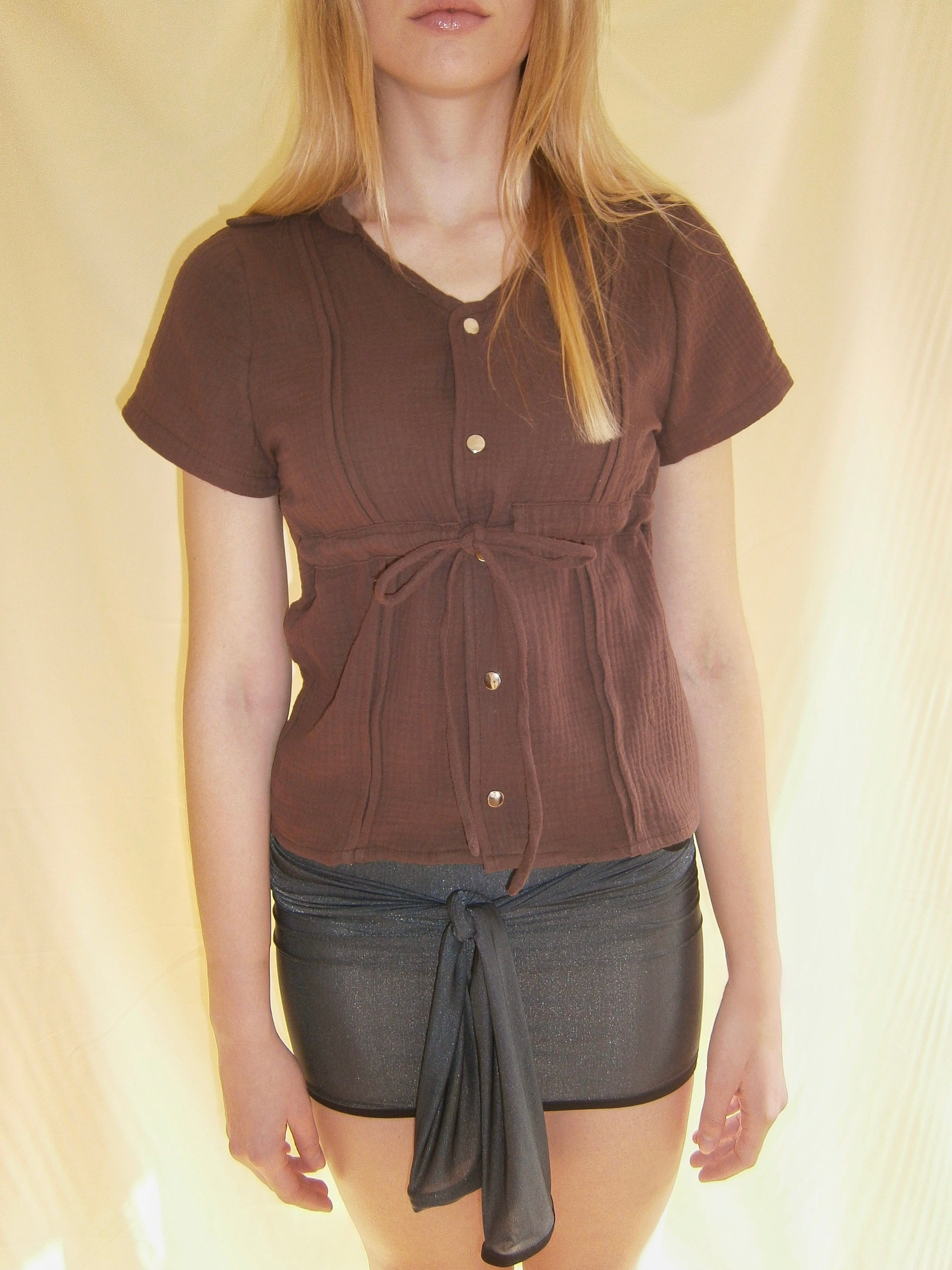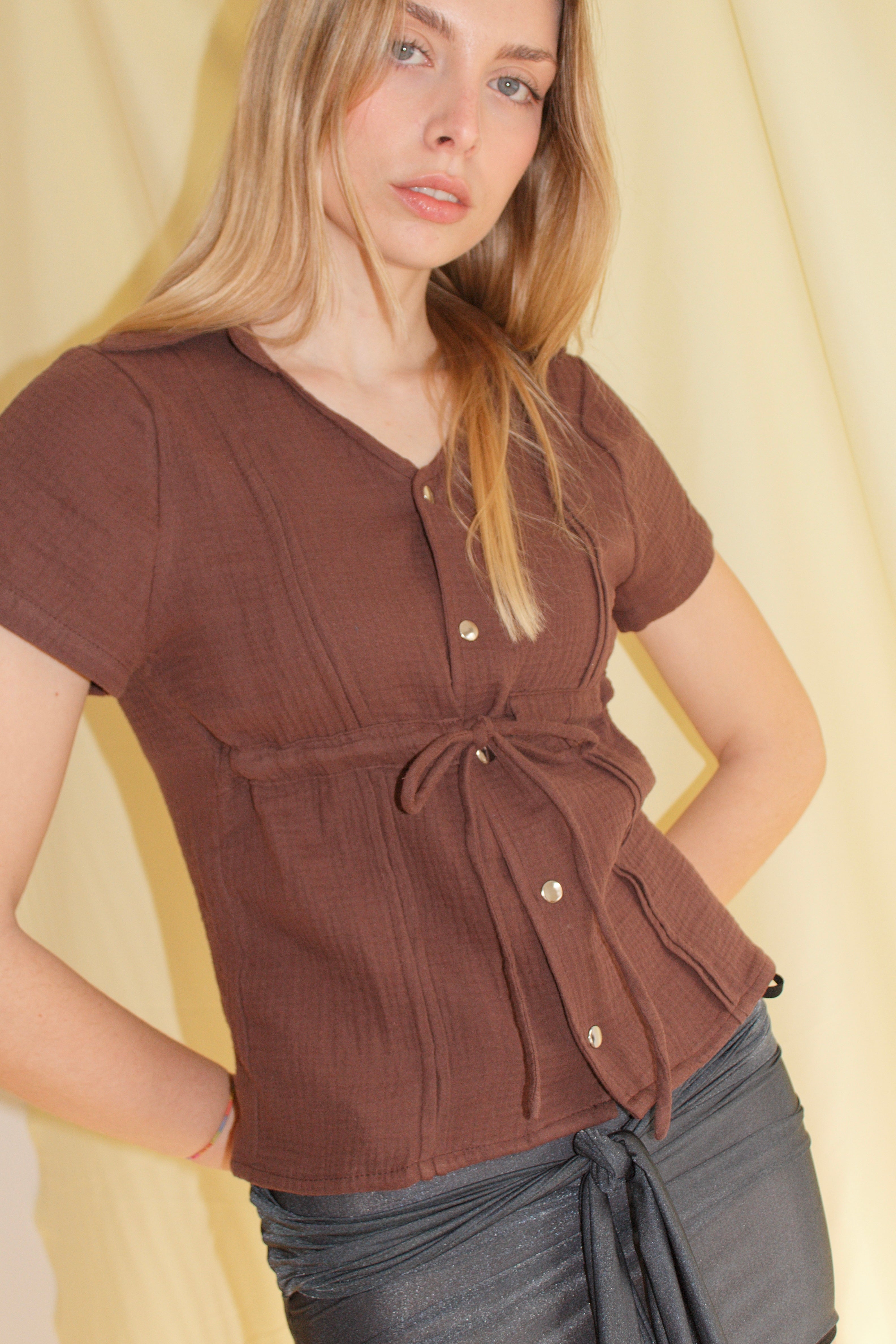 V-neck cotton gauze shirt in deep brown with adjustable chest drawstring, metallic snap button closure, and straight hem. Made in Spain. Hand wash max 30°C, do not tumble dry or bleach.