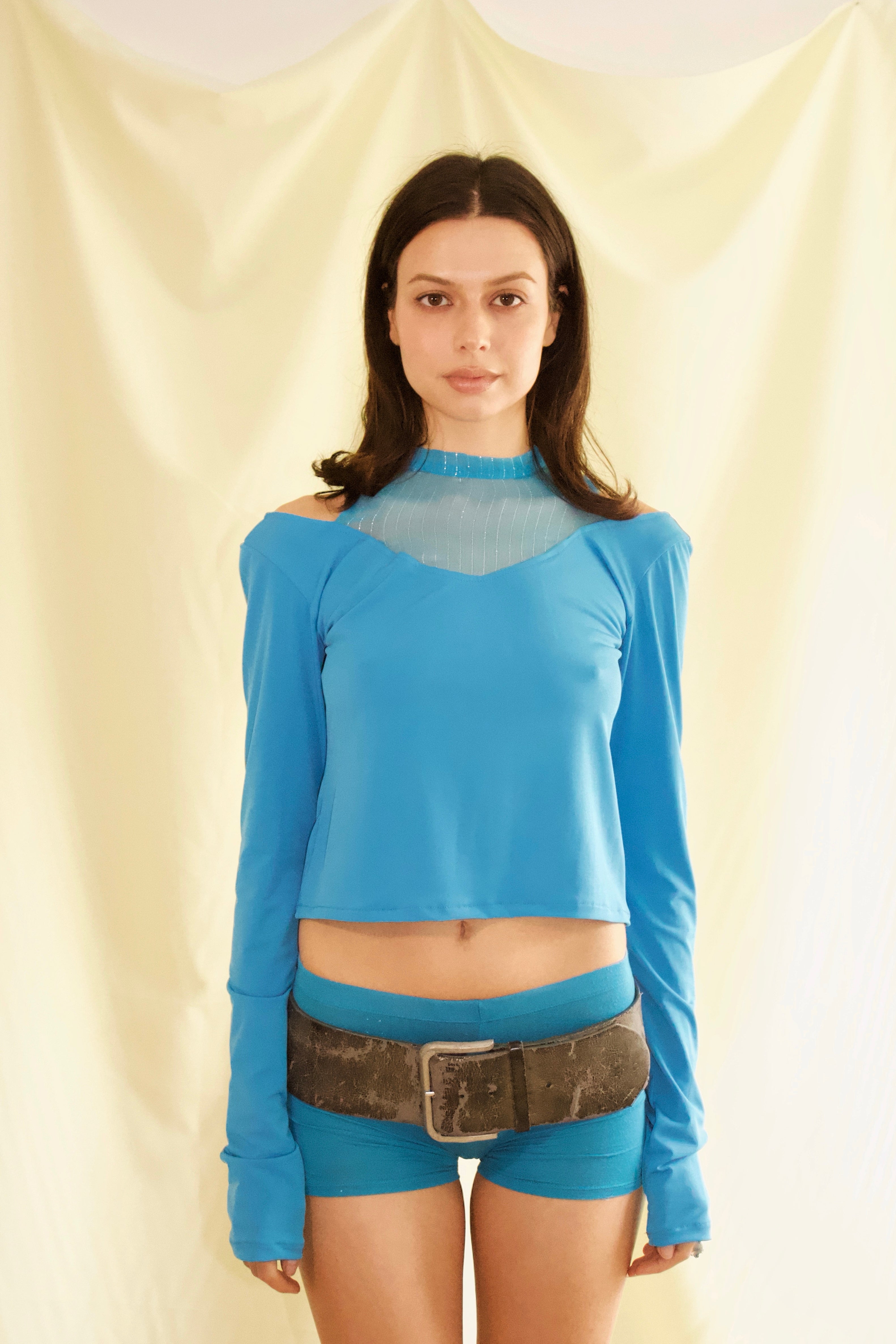 Long-sleeve top made from elastic knit viscosa and elastan, silk fabric halter neckline. Blue color, made in Spain. Gentle wash at max. 30°C.