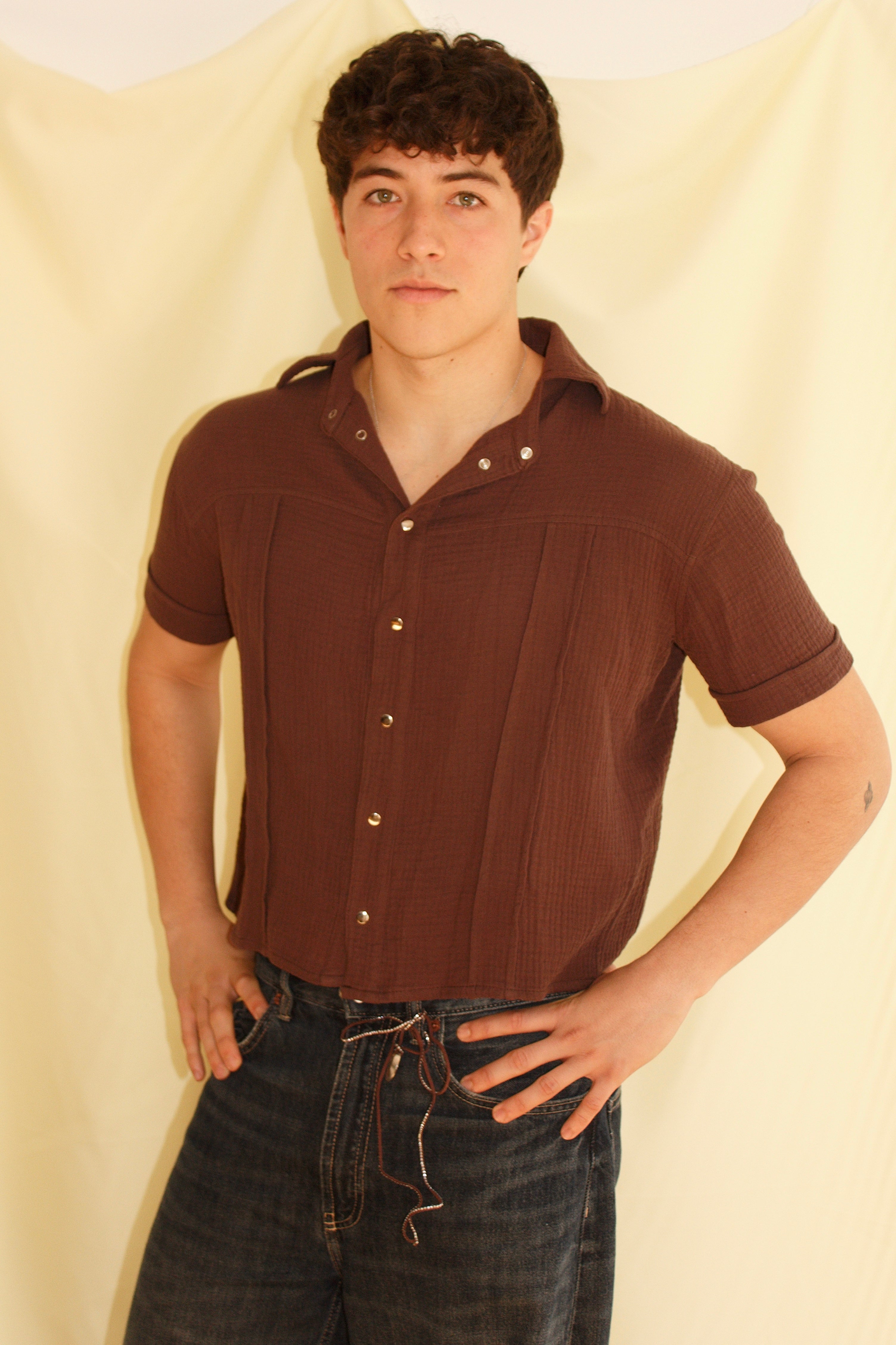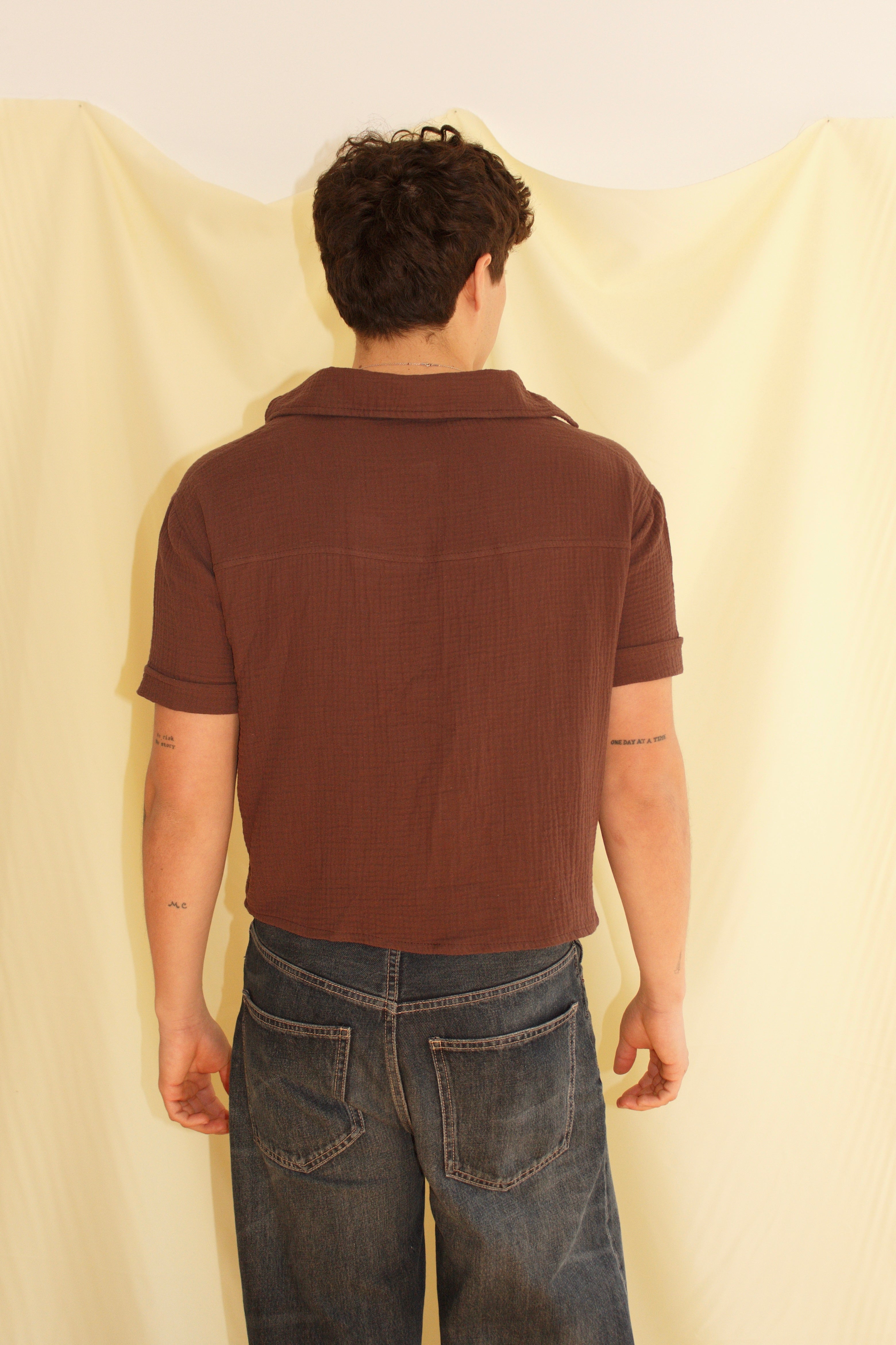 Short sleeve shirt in deep brown, made from 100% soft, breathable cotton gauze with crinkled texture, camp collar, and snap button closure. Made in Spain. Hand wash max 30°C, do not tumble dry or bleach.