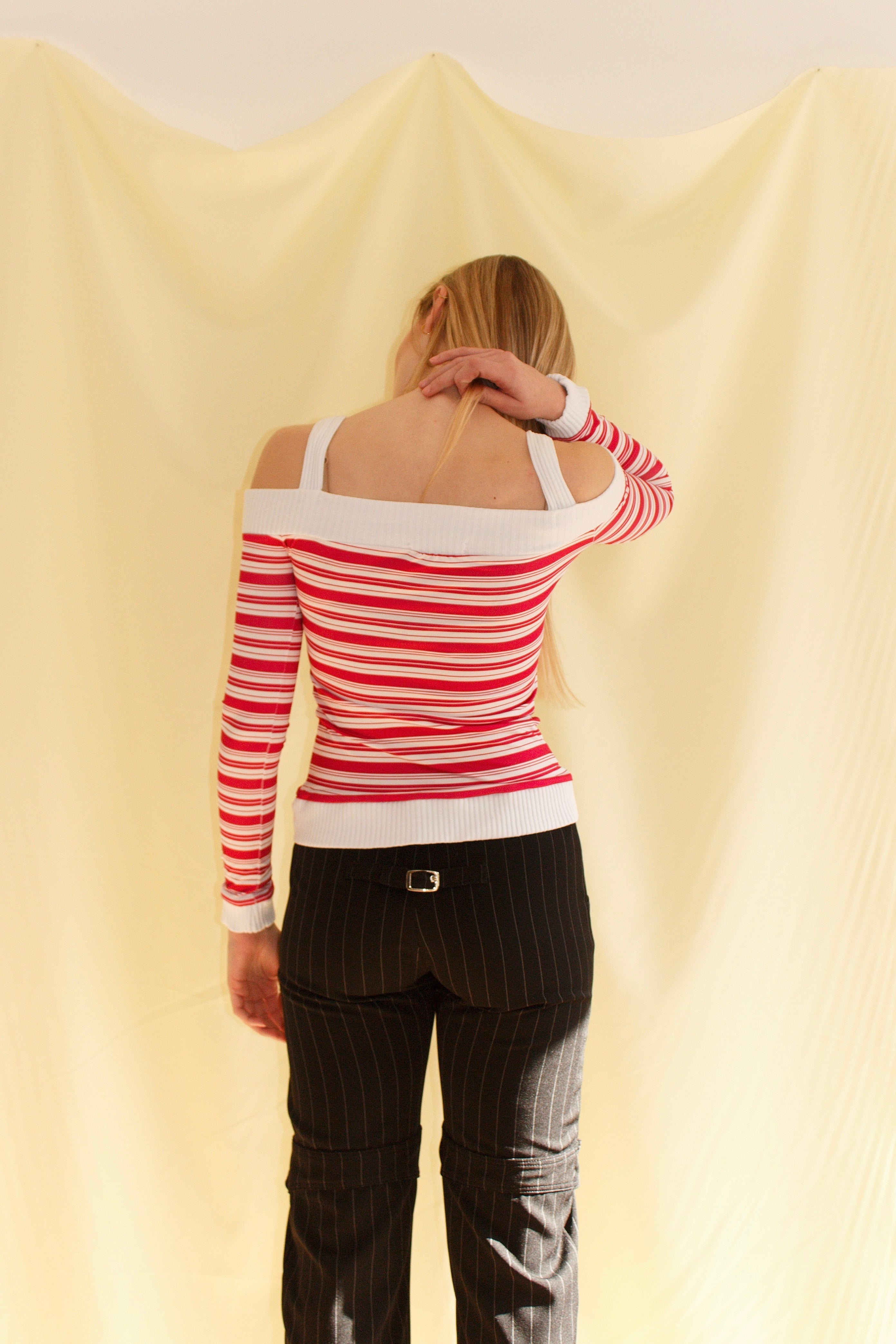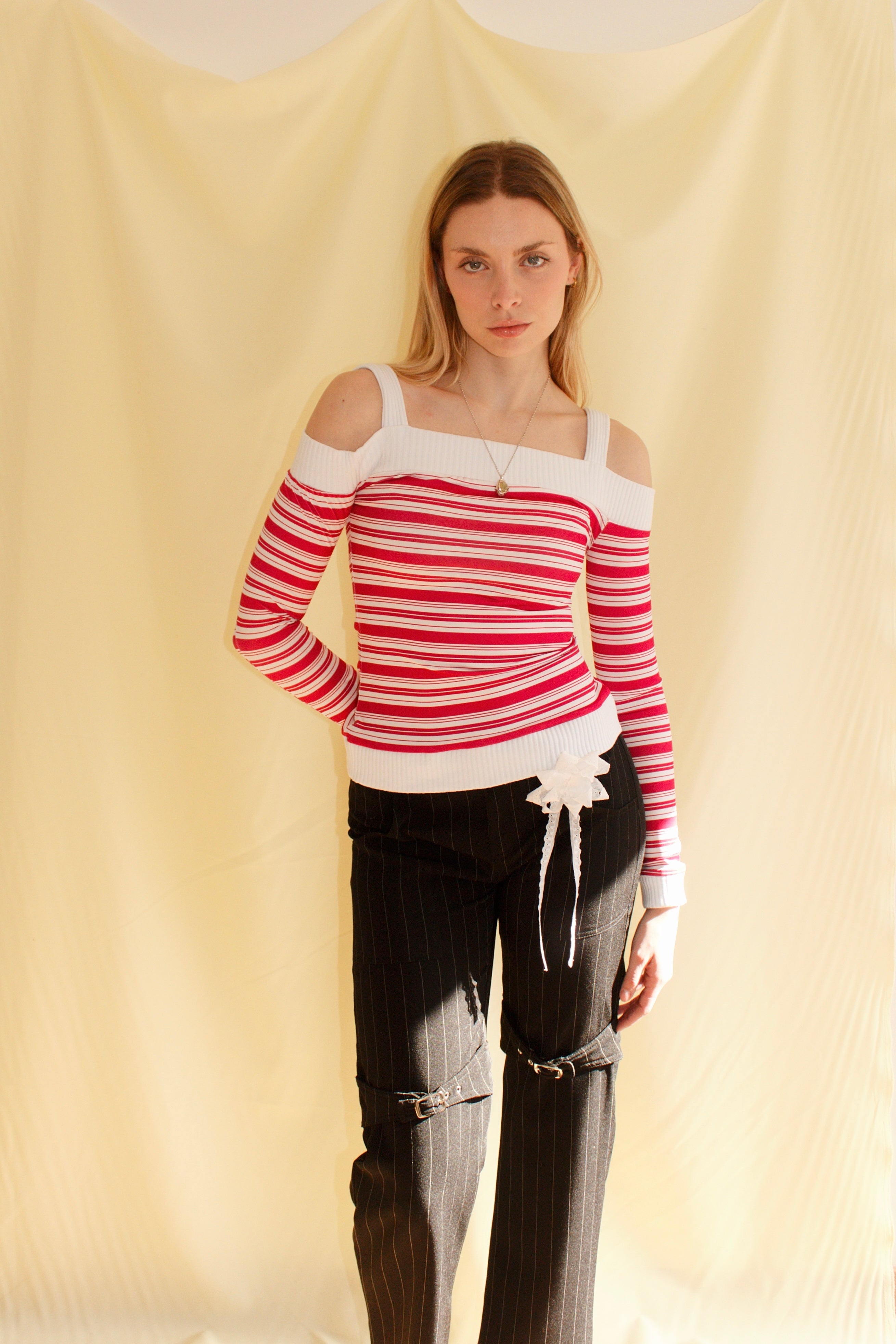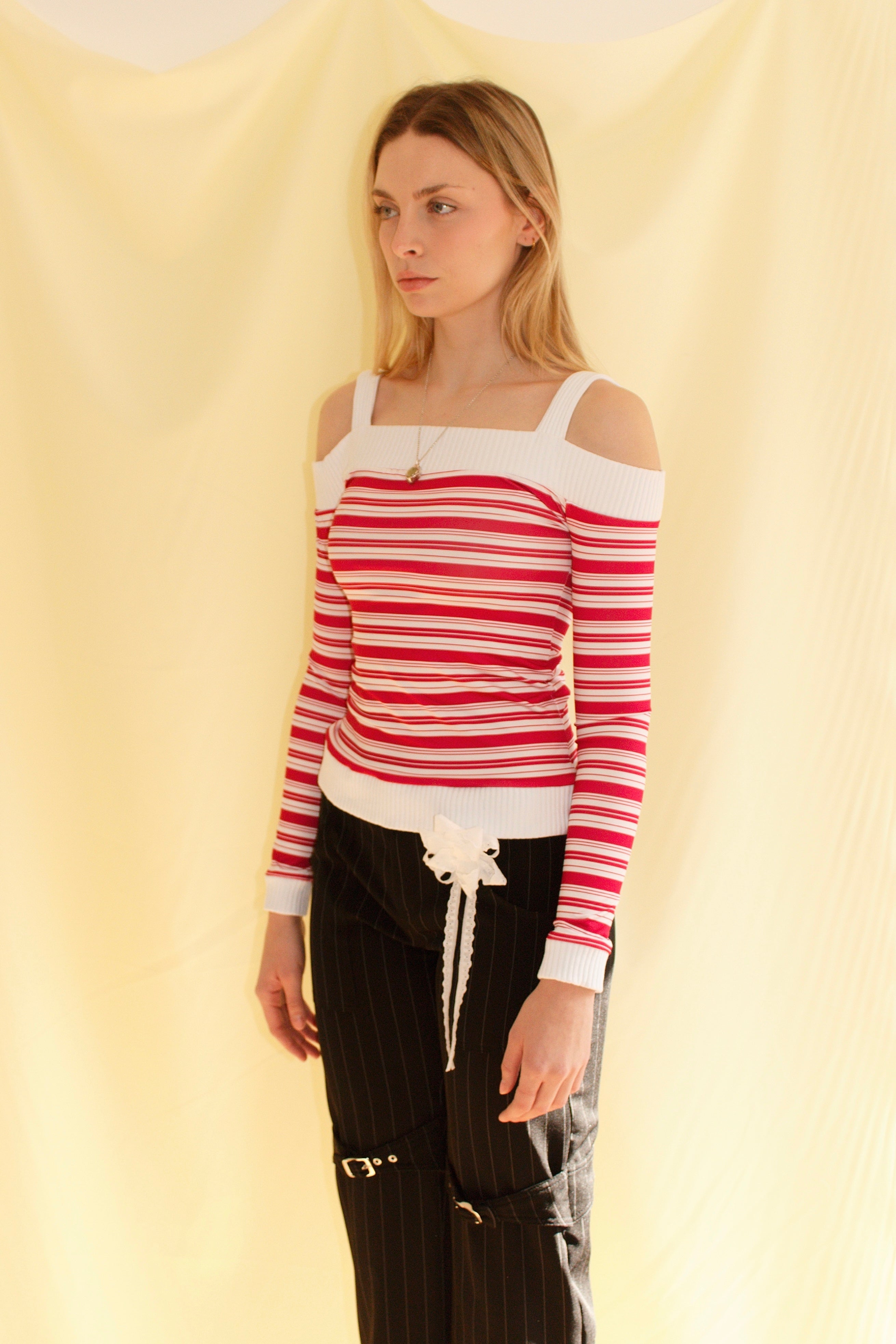 Off-shoulder striped top in red and white with ribbed trims, made from Lycra-blend body for stretch and comfort. Made in Spain. Machine wash cold max 30°C, do not tumble dry, bleach, or iron.