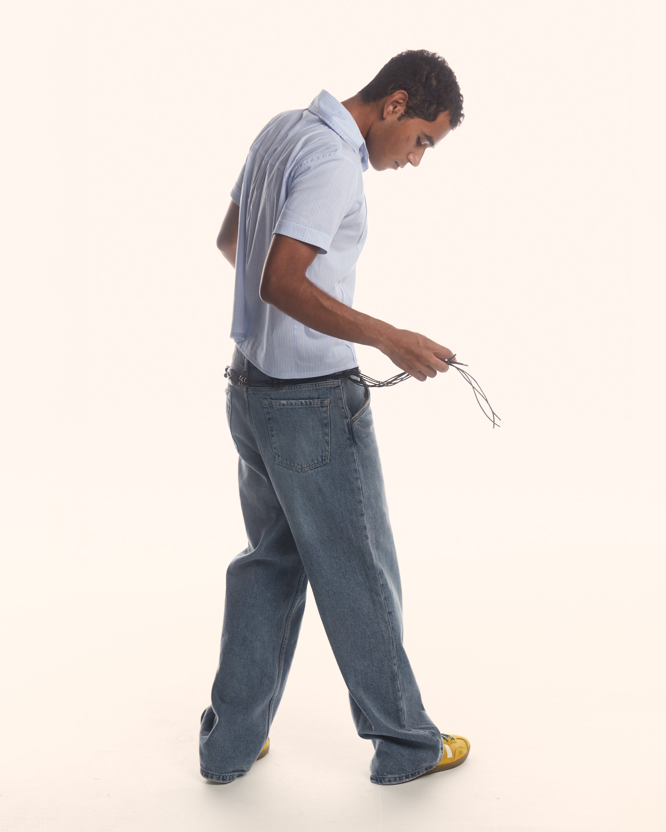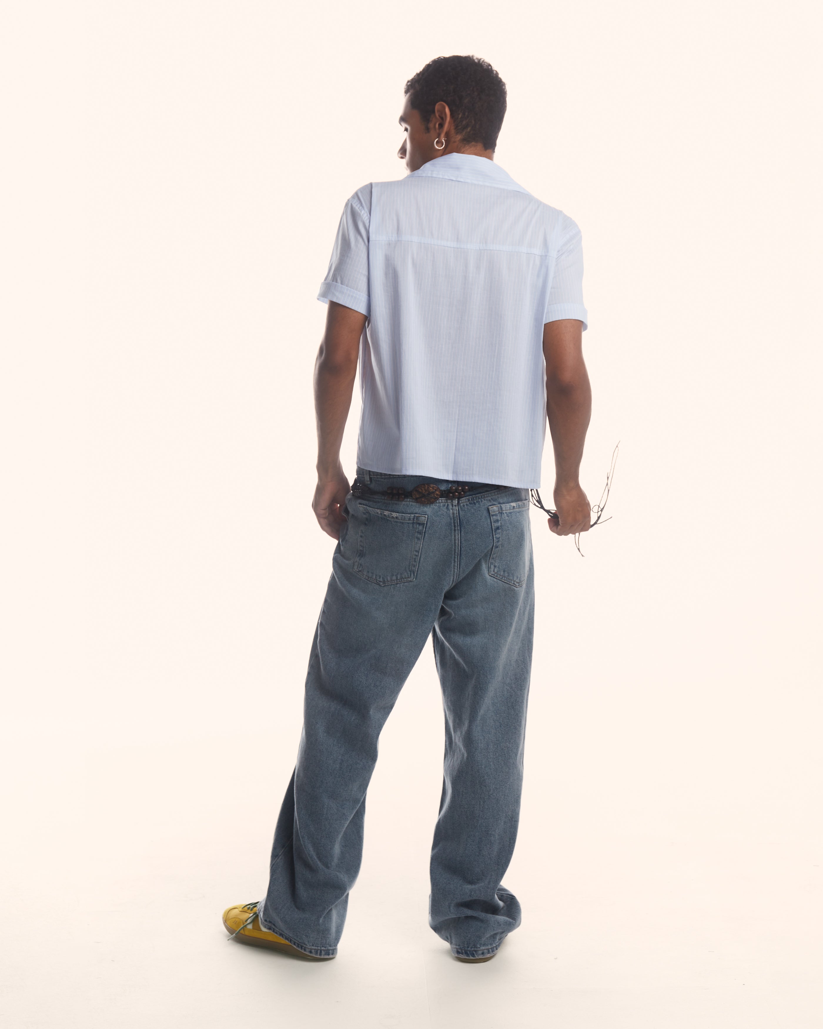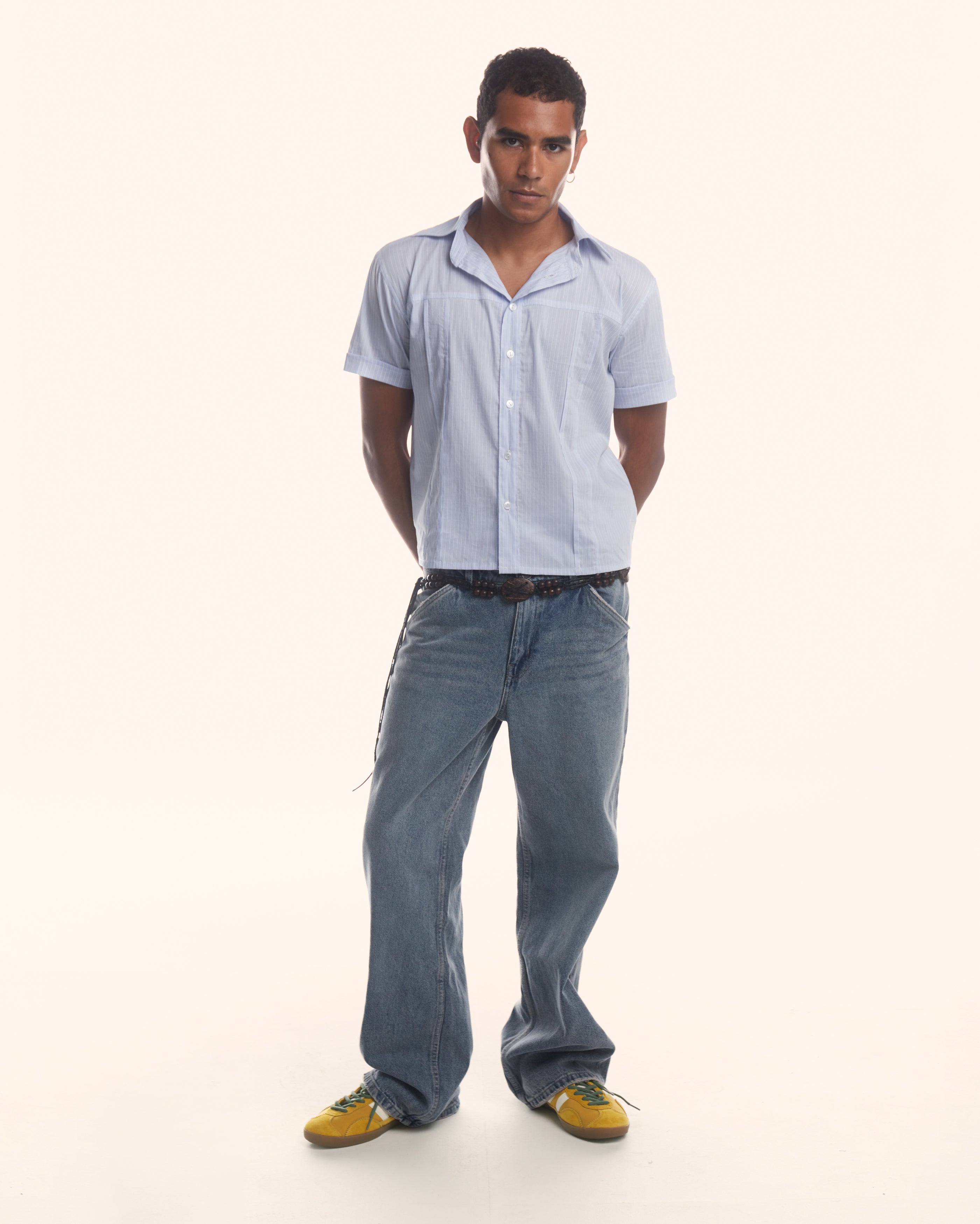 Striped short sleeve shirt made from 100% lightweight, breathable cotton with crinkled texture, camp collar, and snap button closure. Made in Spain. Hand wash max 30°C, do not tumble dry or bleach.