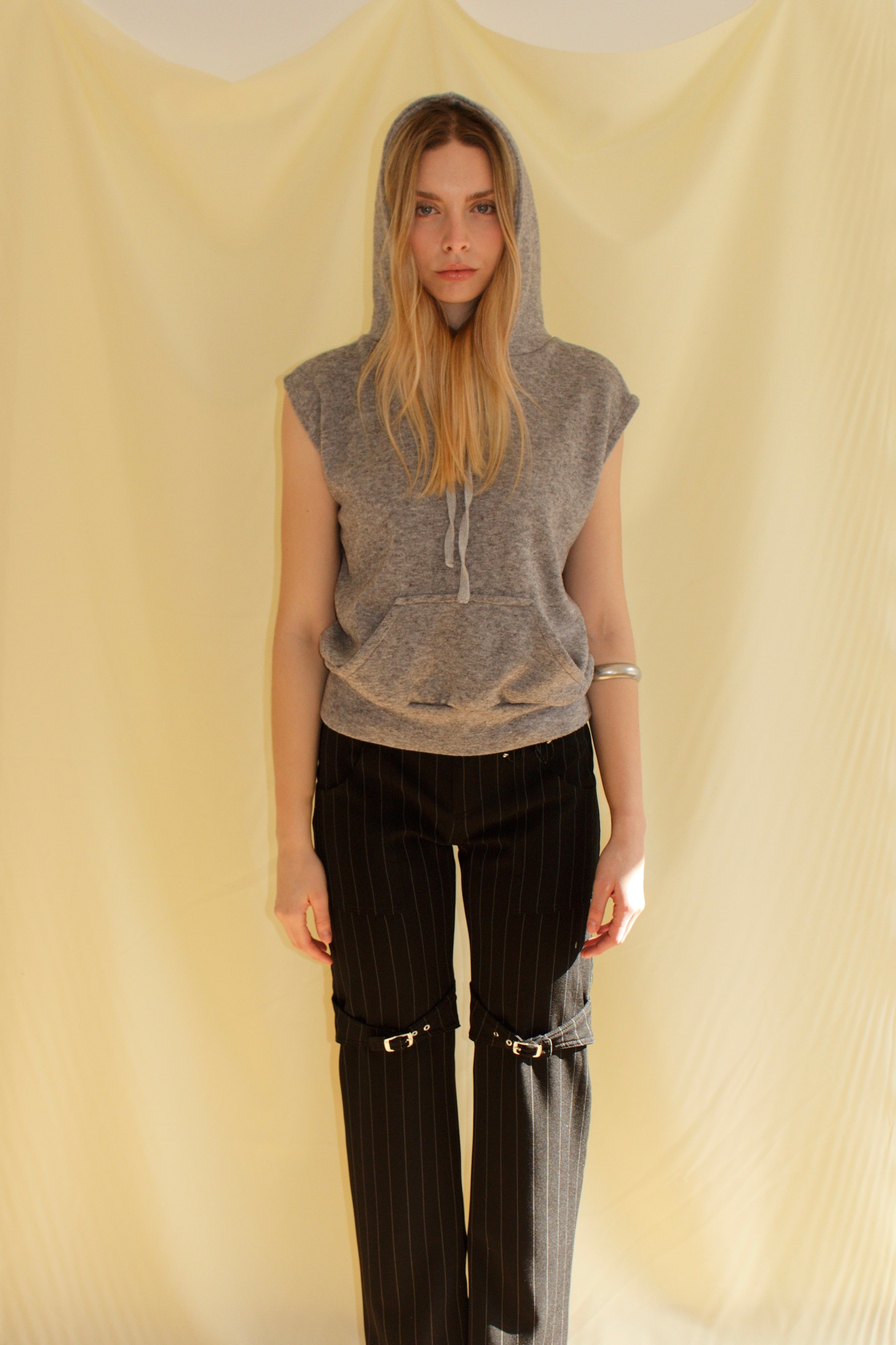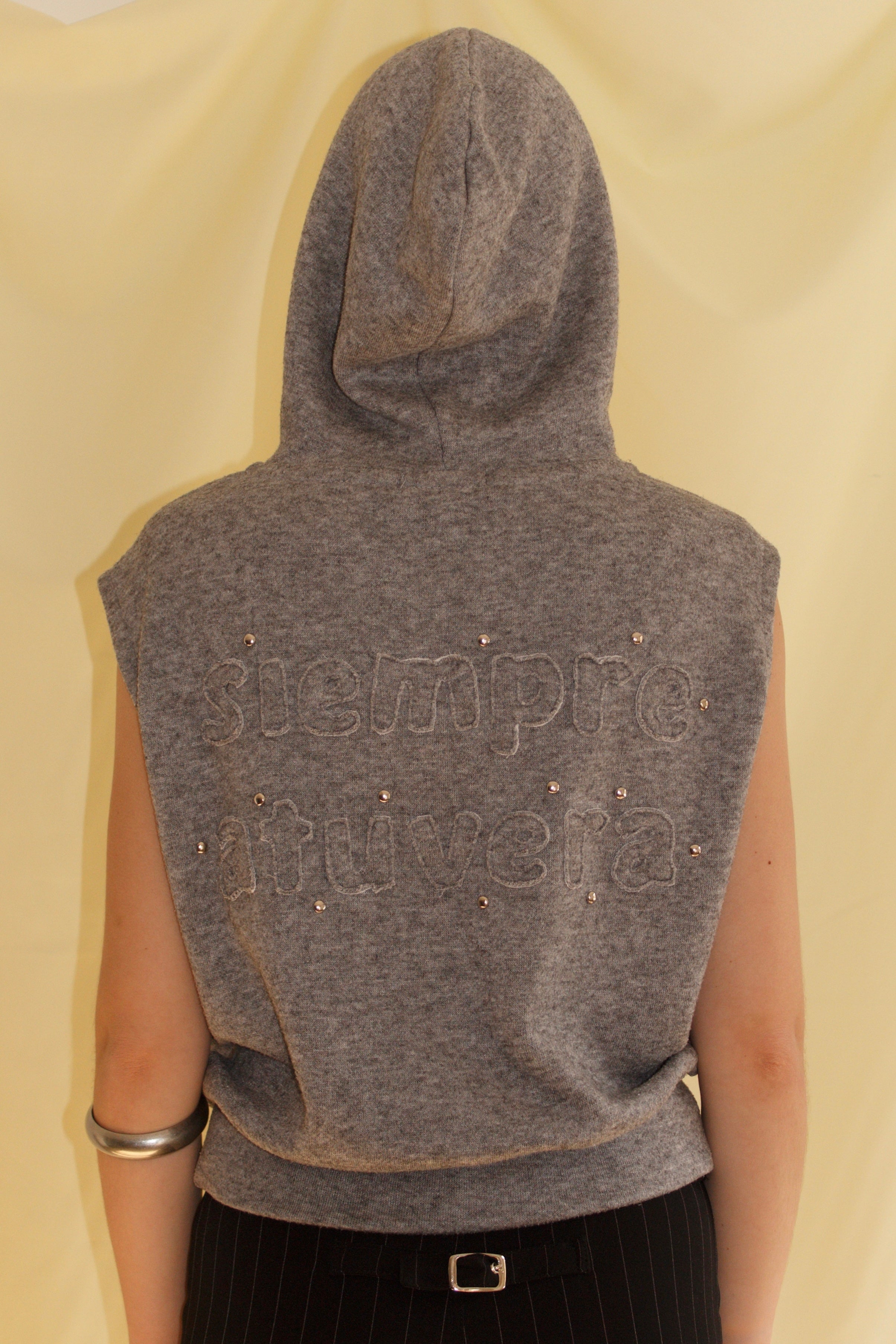 Sleeveless gray hoodie made from a soft, stretchy cotton blend with drawstring hood and embroidered back detail. Made in Spain. Machine wash cold, iron inside out at low, do not tumble dry or bleach.
