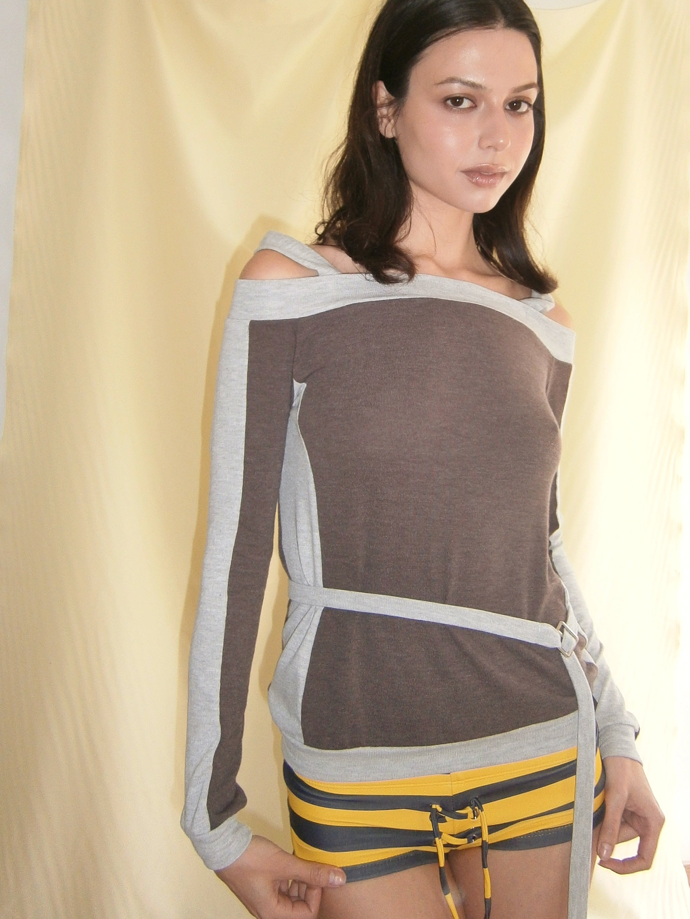 Long-sleeve top made from cotton fabric, featuring an off-the-shoulder neckline with double straps and contrasting panel details. Grey color. Made in Spain. Gentle machine wash at max. 30°C.