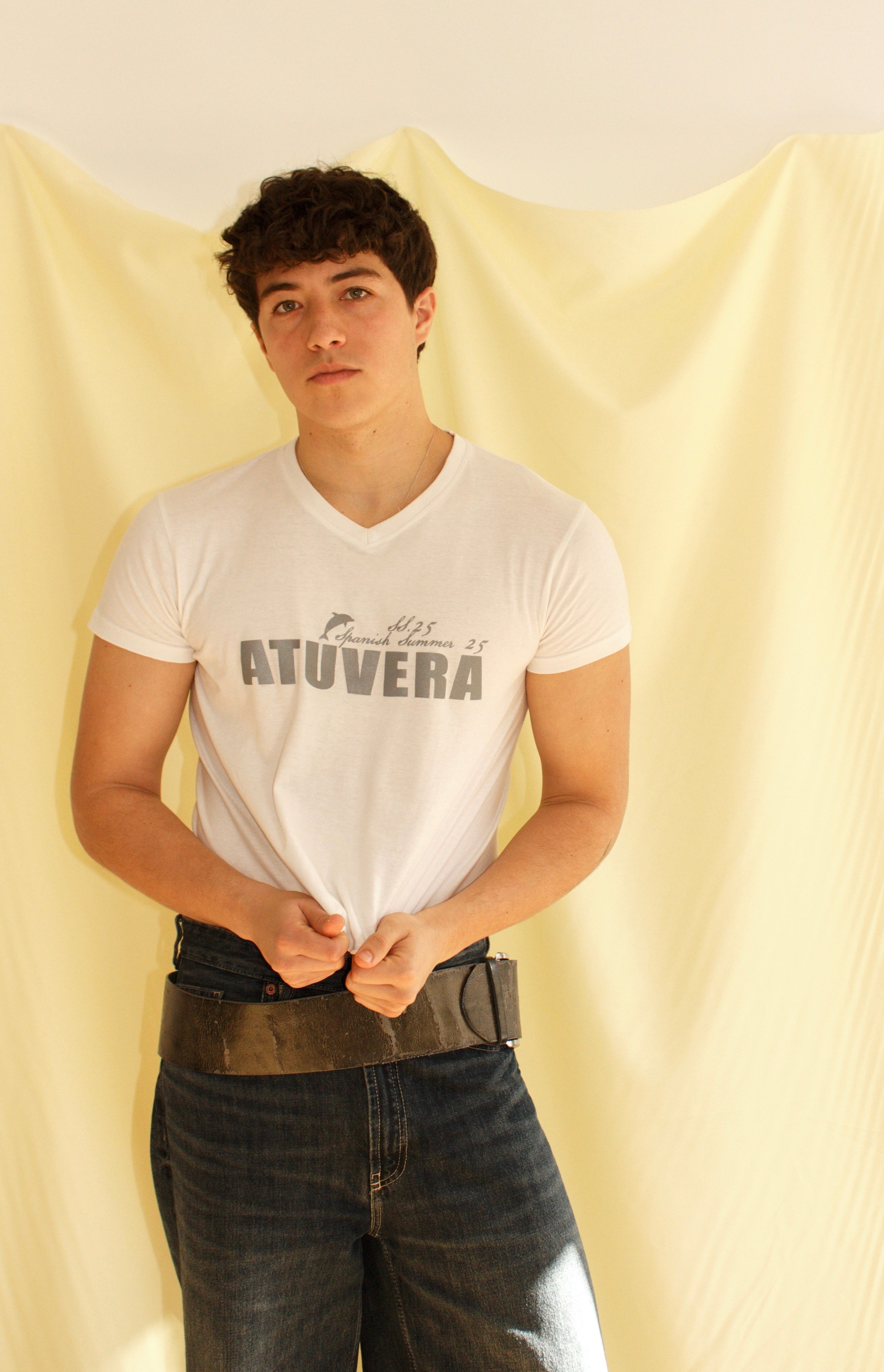 Atuvera SS25 V-neck short-sleeve T-shirt in white and metallic, made from 100% soft, breathable cotton with front screen print. Made in Spain. Wash inside out below 30°C, do not tumble dry or bleach.
