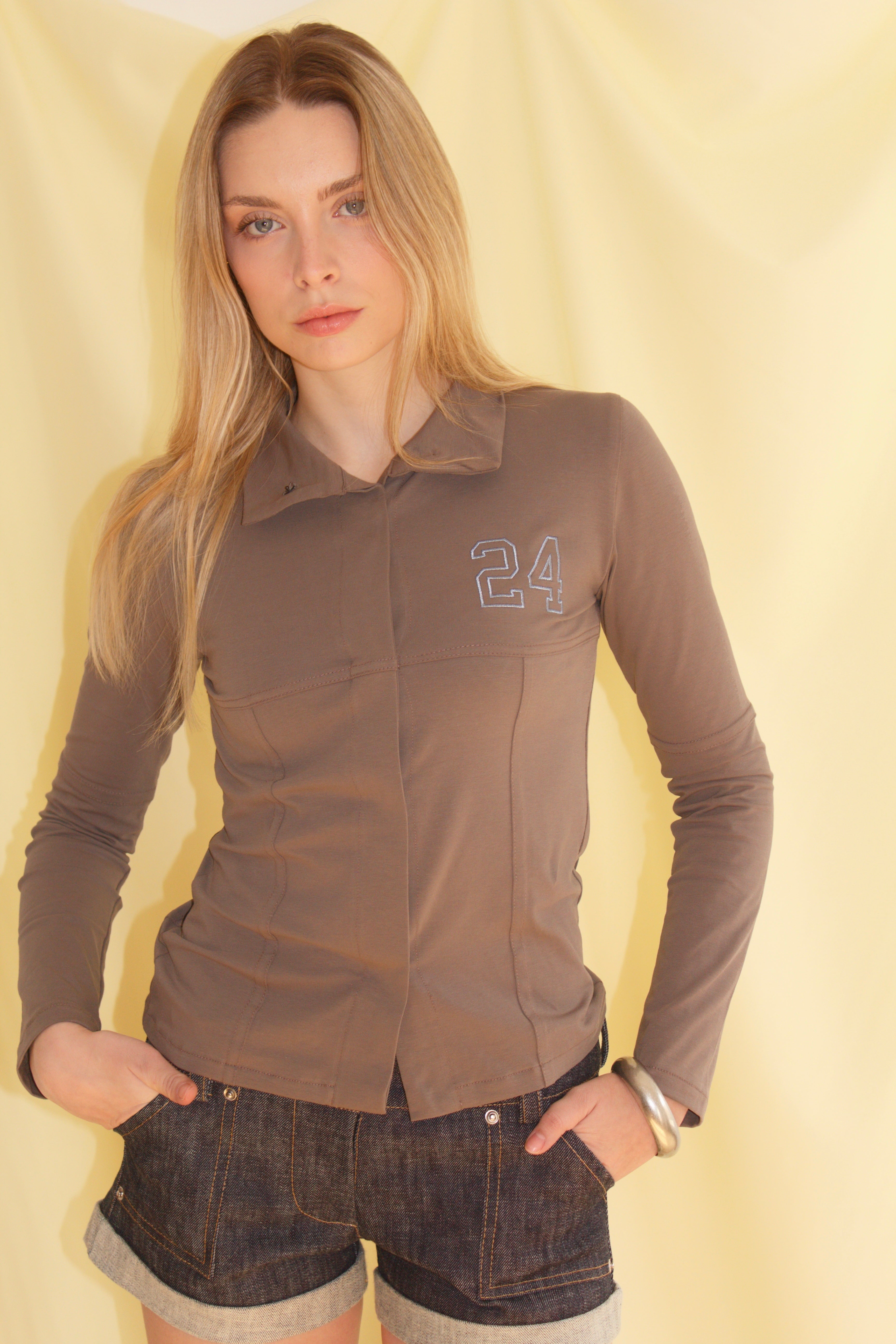 Shirt with embroidered details and visible seams, featuring a high neckline that can be worn open into a V-neck. Made from a cotton-blend stretch fabric. Grey color. Made in Spain. Machine washable 30º max.